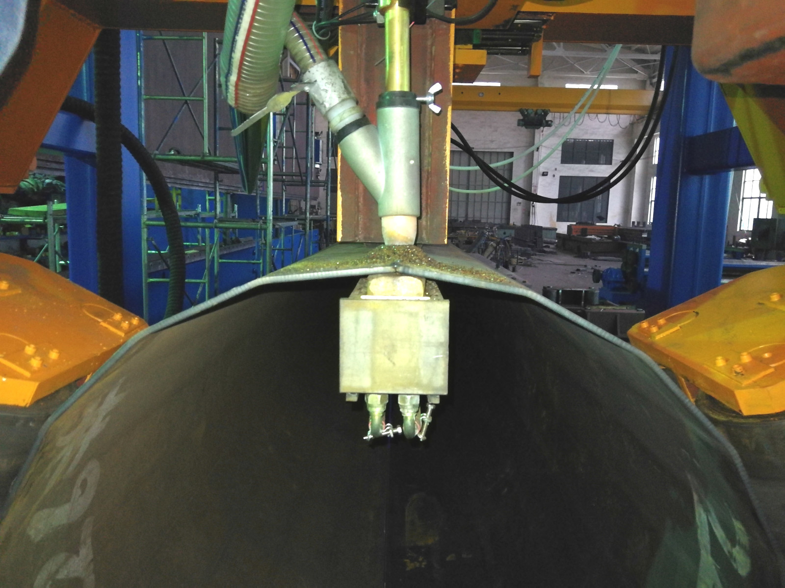Untuk dua tiang jahitan, ketika pengelasan jahitan pertama selesai, roller bawah akan naik dan memutar tiang ke posisi jahitan lain untuk memulai pengelasan jahitan kedua.