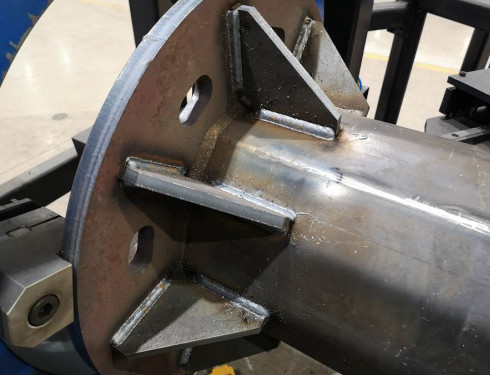 Pertama-tama jahitan keliling dalam dan luar dari pelat dasar tiang dilas, dan kemudian tulang rusuk penguat dari pelat dasar dilas secara otomatis